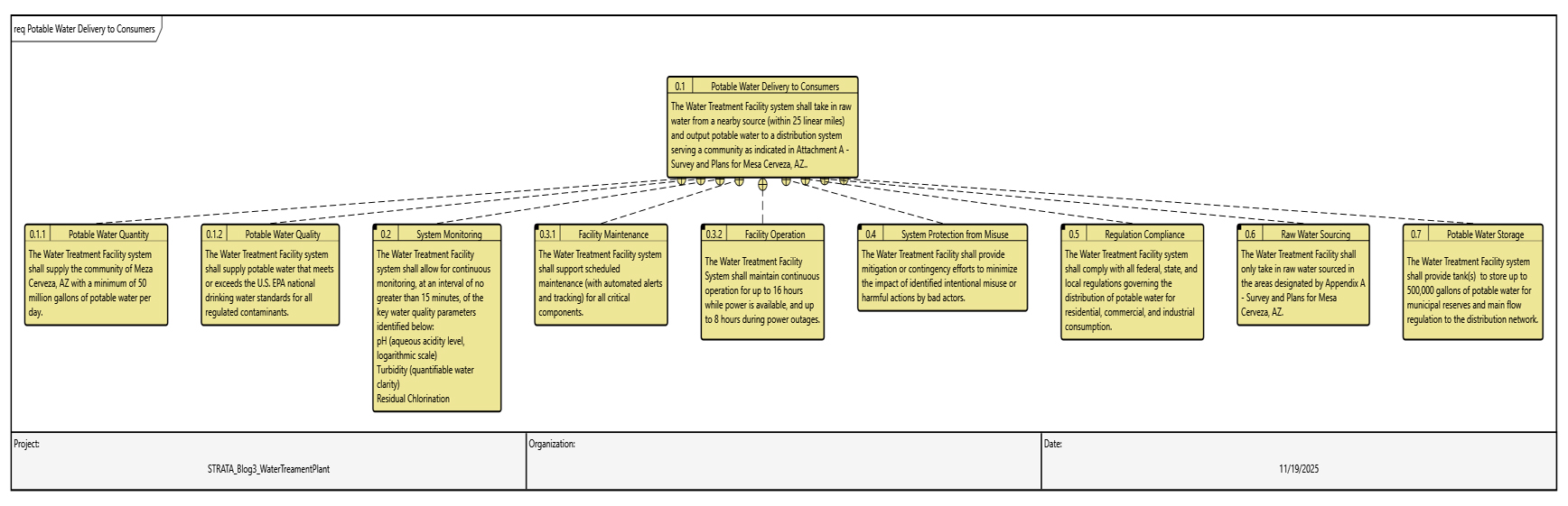 We now have requirements defined at both the system and subsystem levels for our Water Treatment Facility, along with high-level verification planning with everything tied back to the needs established through use cases. Some of these requirements are functional in nature, making functional analysis essential to capture known behaviors and ensure they integrate into a complete, coherent architecture. This process also strengthens traceability by ensuring every function and requirement is linked to its origin, supporting validation and compliance throughout the design lifecycle. Below are examples of functions we can analyze and decompose.