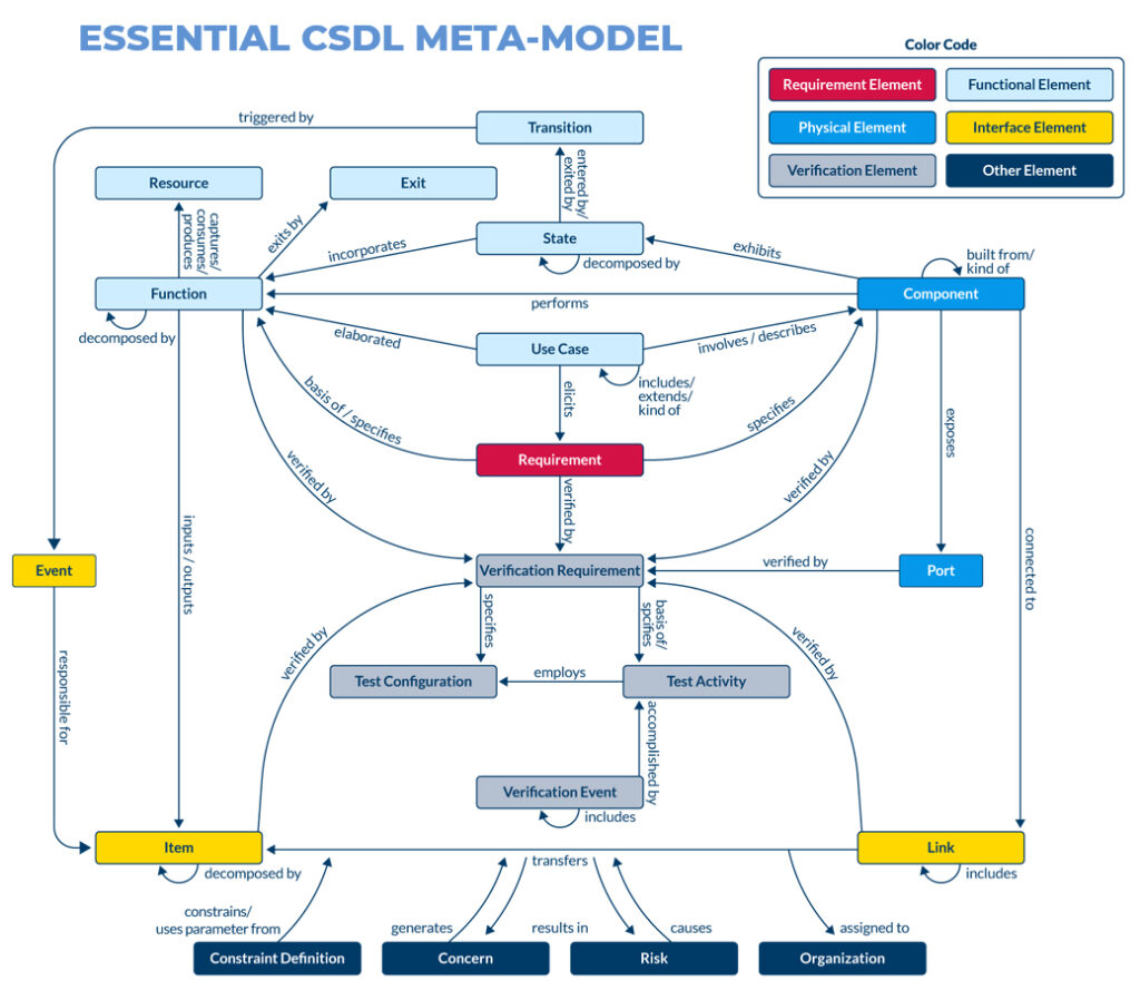 The CSDL is not just a modeling language we can theoretically use to describe what a system does, what a system is, and why it exists. The natural language ontology serves a practical purpose in developing the how/what/why of a system quickly in the way many engineers think about and communicate system development tasks. The essential meta-model presented here shows that other foundations of Systems Engineering can be joined into our architecture descriptions: Use Cases, Verification/Validation, System States, and Risks/Concerns to name a few. Next time, we’ll delve into how the CSDL schema can be modified and extended to align with how your organization thinks about these SE foundations.