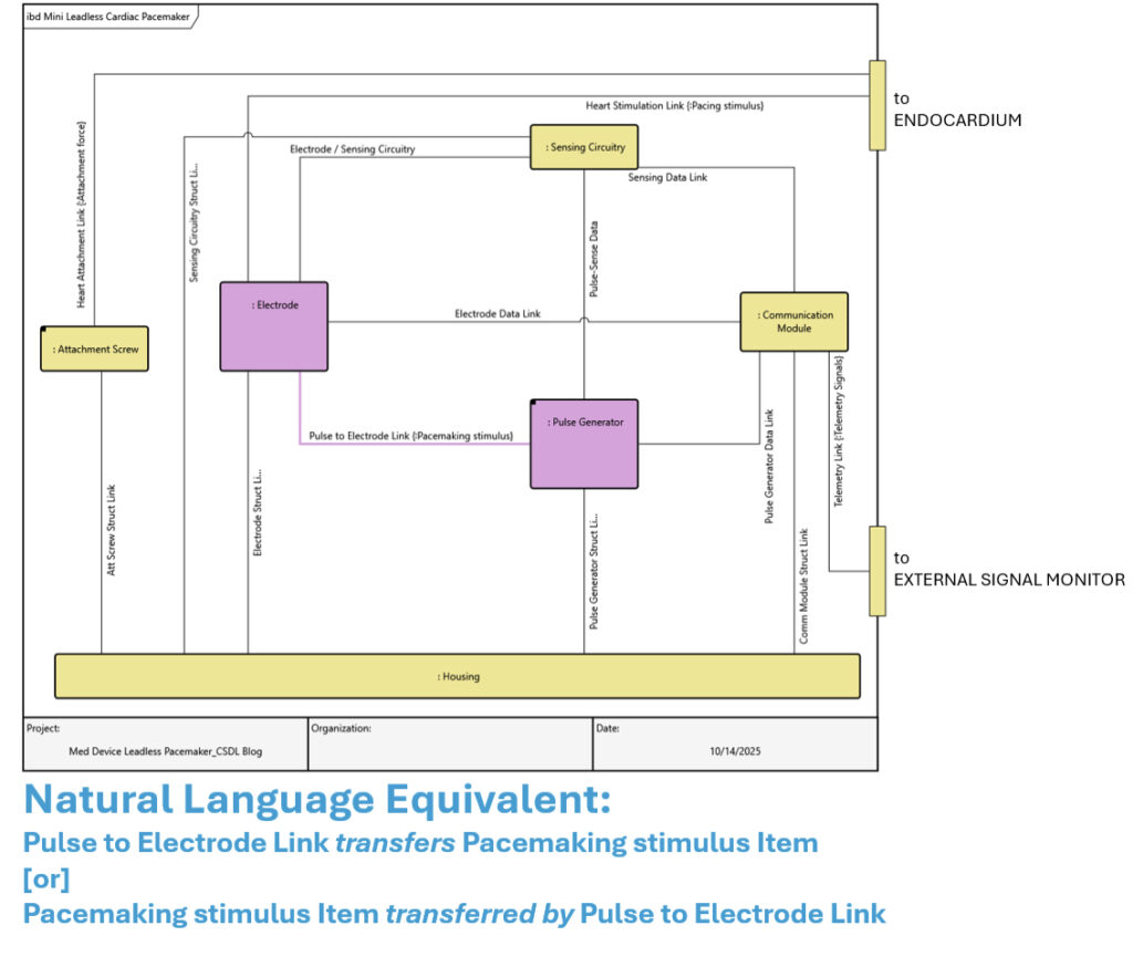 To better specify the interfaces, we could describe the nature of the interfaces in more detail. What electrical signal is exchanged between the Pulse Generator and the Electrode, for instance? The CSDL meta-model indicates that a Link entity representing an interface can be informed with one or more entities of the Item class, and transfers/transferred by relates these two classes. An Item can be anything that crosses a Component boundary, such as data, signals, forces, or even physical objects. In this case, our Item will be an electrical signal called Pacemaking stimulus, which will be transferred by the “Pulse to Electrode Link”. A Flow Internal Block view can help us visualize this: