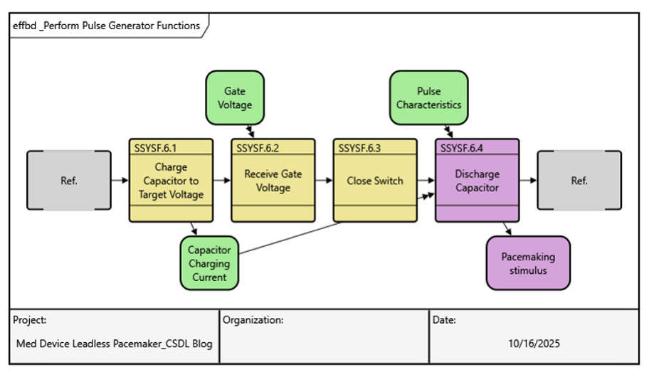 Now we are beginning to describe the behavioral architecture of this pacemaker, “what the system does”. Functions can be ordered hierarchically with the decomposes/decomposed by relationship, but it is much more descriptive to represent the logical flow of Functions throughout the system with a set of structured representations. GENESYS has two views that illustrate this: the Activity Diagram and the Enhanced Functional Flow Block Diagram (EFFBD). Each has its own merits, but generally the EFFBD is best suited for a general audience while still representing function and item flows. Leaving the full explanation of the executable constructs we can use to describe the system behavior for a future blog, at a high level, we can show a simplified EFFBD representing an intended behavior that creates the “Pacemaking stimulus” Item.