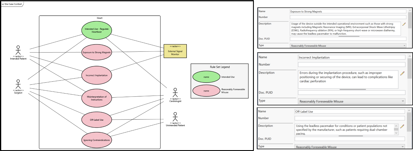 Figure 1: Customized Use Cases and Use Case Diagram distinguishing “intended use” use cases from “reasonably foreseeable misuse” cases with displayed legend and customized coloring rules.