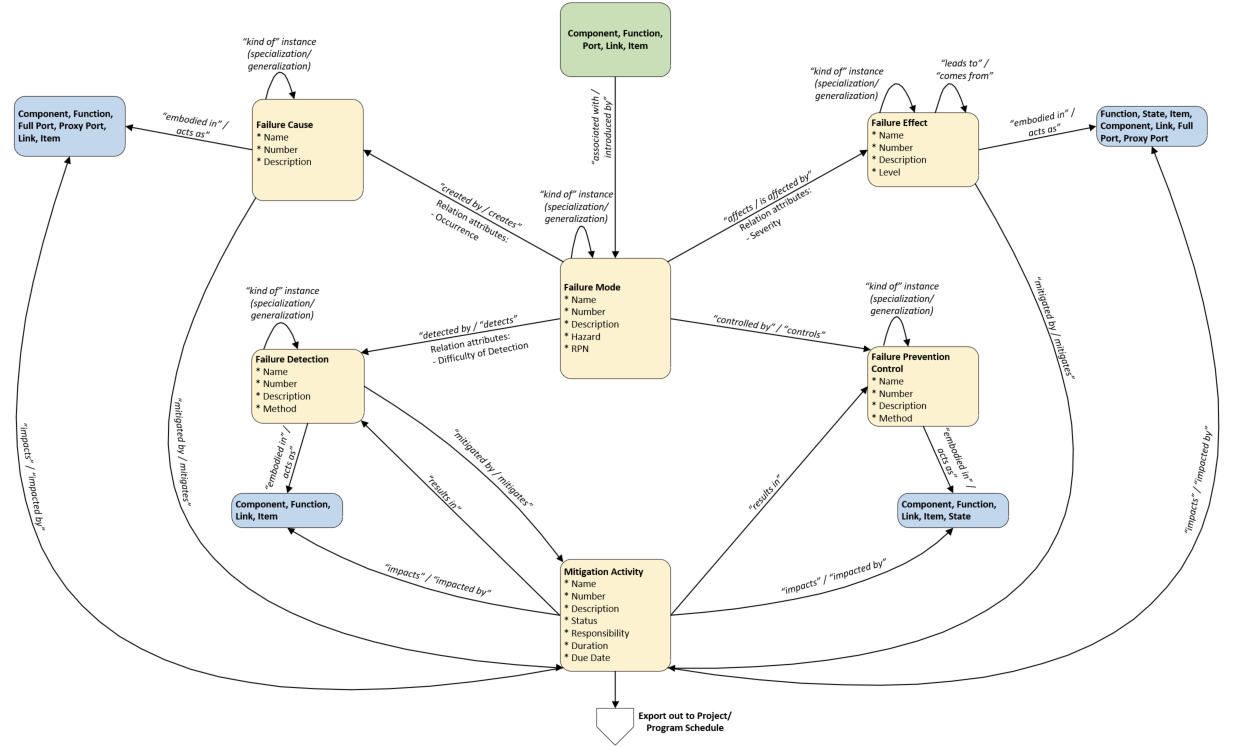 We developed an extension that introduces specialized classes and attributes for FMEA concepts. For example, failure modes can be linked to specific components, functions, ports, links, or items and severity, occurrence, and detection ratings can be stored as relationship attributes. This enables engineers to visualize risk relationships and trace mitigation strategies throughout the architecture.